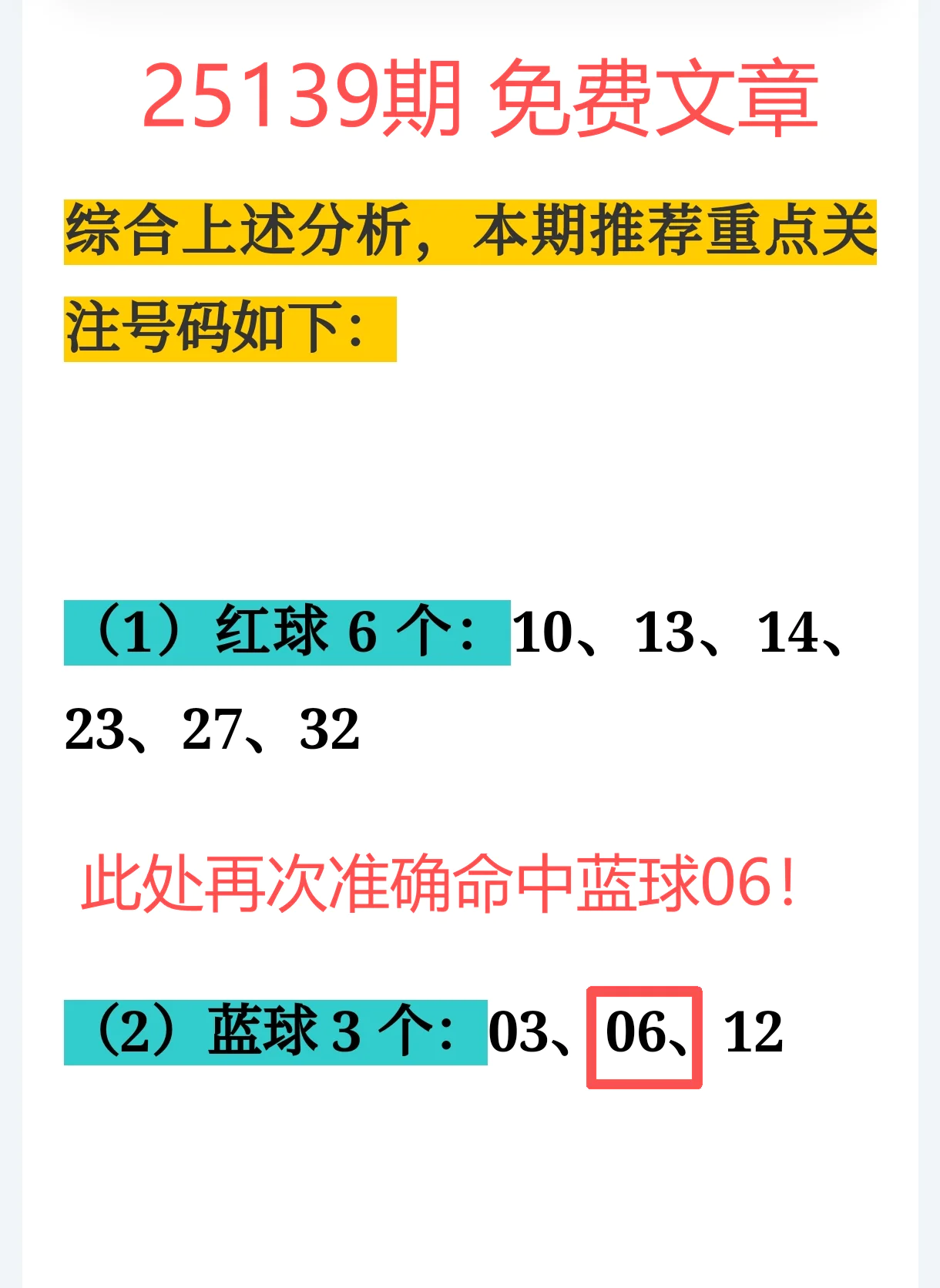 ✅ 重点号码池:推荐中再次命中蓝球06,多维印证方向判断力!