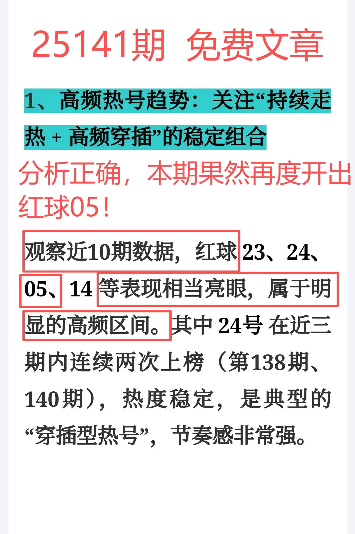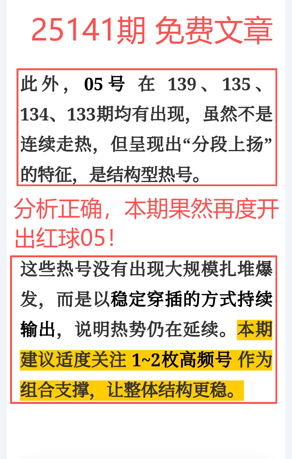 1、高频热号:准确命中红球05,延续连红节奏,热号判断依然稳;