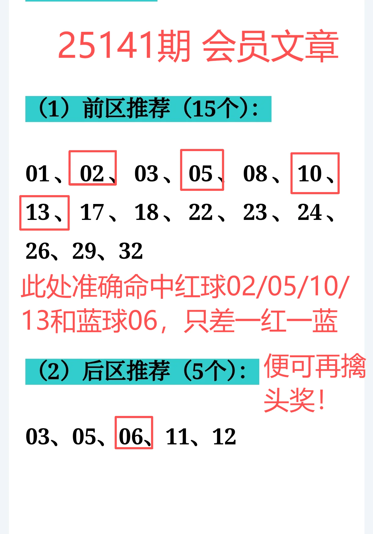 5、重点号码命中:红球02、05、10、13 + 蓝球06,仅差一红一蓝就能抱走大奖,实力只差临门一脚;