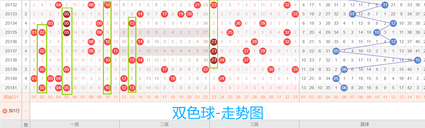 (1)红球(6个):02、05、10、13、14、23