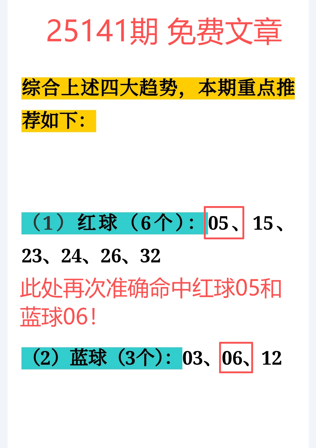 4、重点关注号:红球05、蓝球06双双命中,免费方案一样能吃鸡!