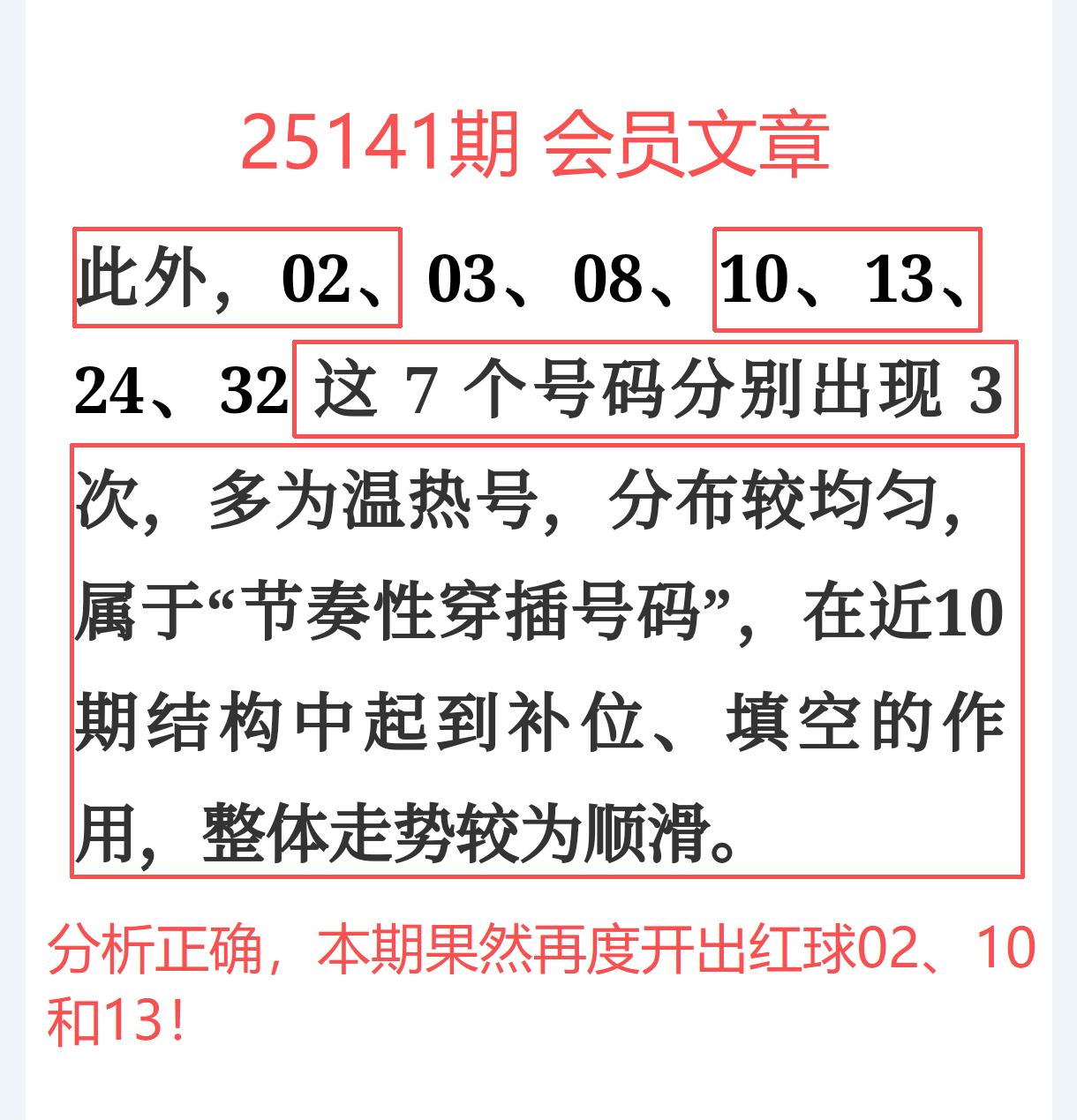 3、重复号分析:准确命中红球02、05、10、13,经典组合逻辑完美兑现;