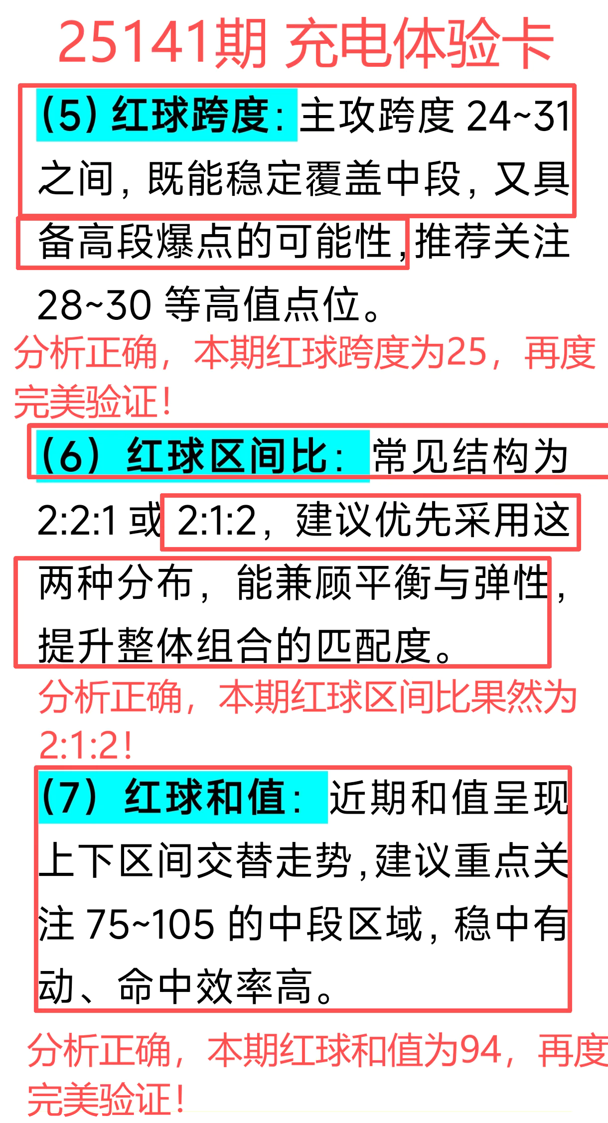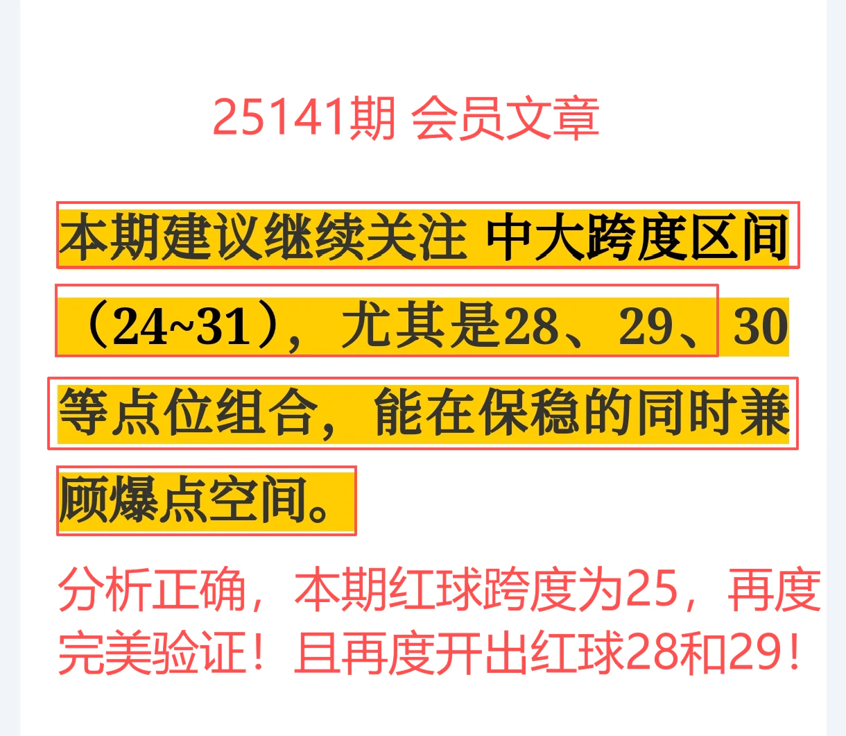 红球跨度25准确落在建议区间“24~31”内,红球28、29同步命中,三区爆点精彩兑现!