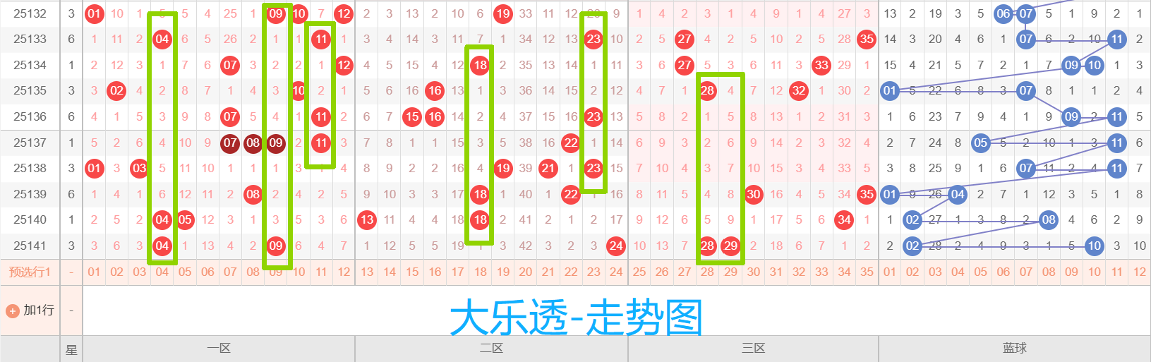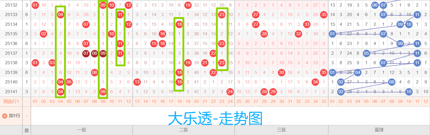 关键词:大乐透、杀号、高频热号、冷号回暖、连号和重复号、跨度、区间比、012路、质合比、复式、胆码、走势