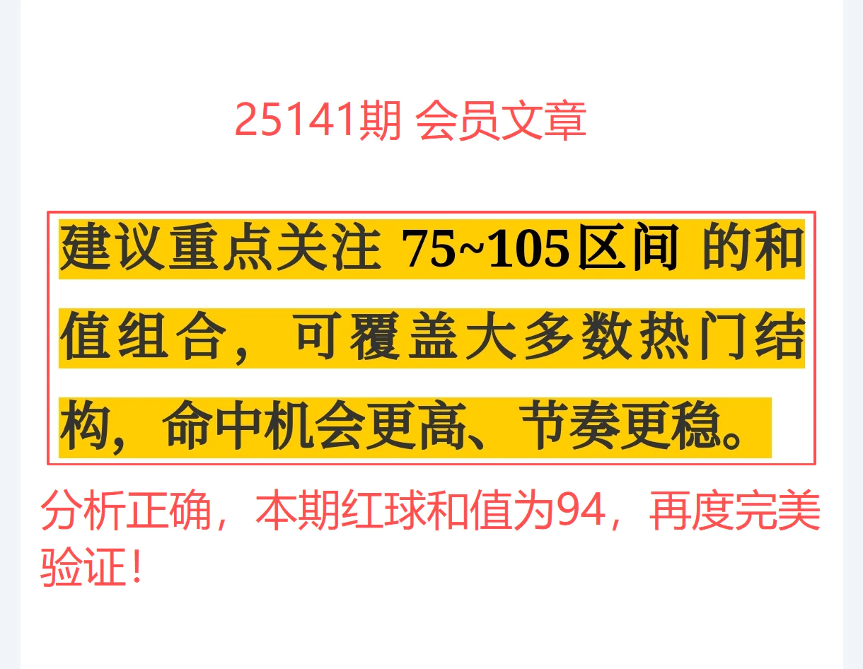 红球和值为94,精确落点于建议主攻区间“75~105”中段偏上位置,结构判断再添一功!