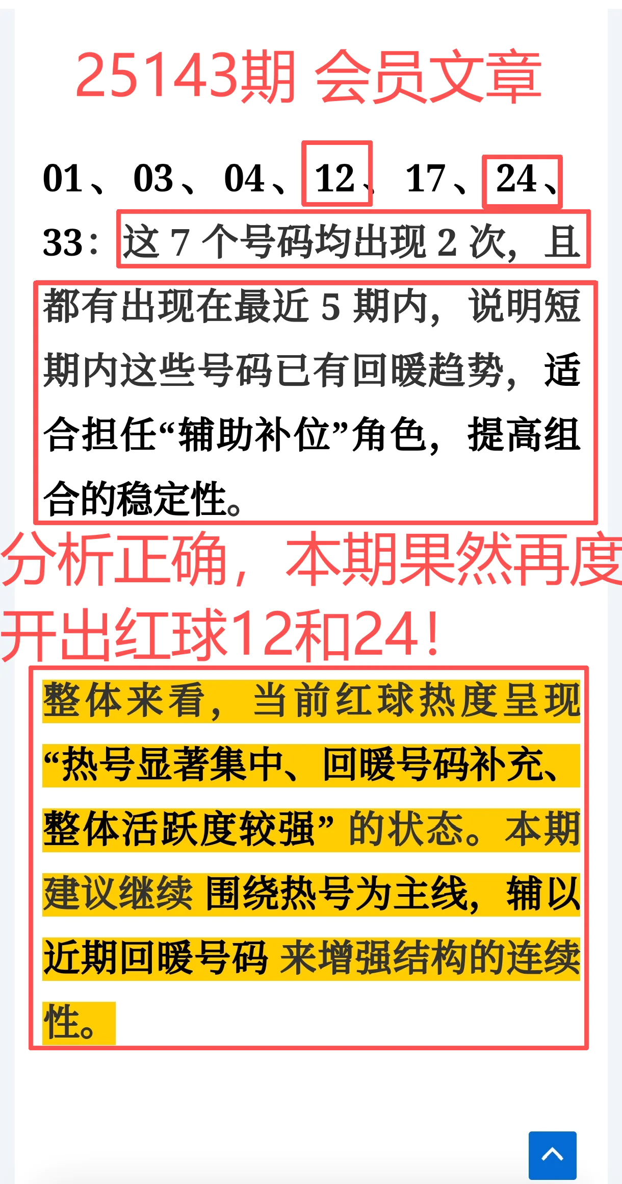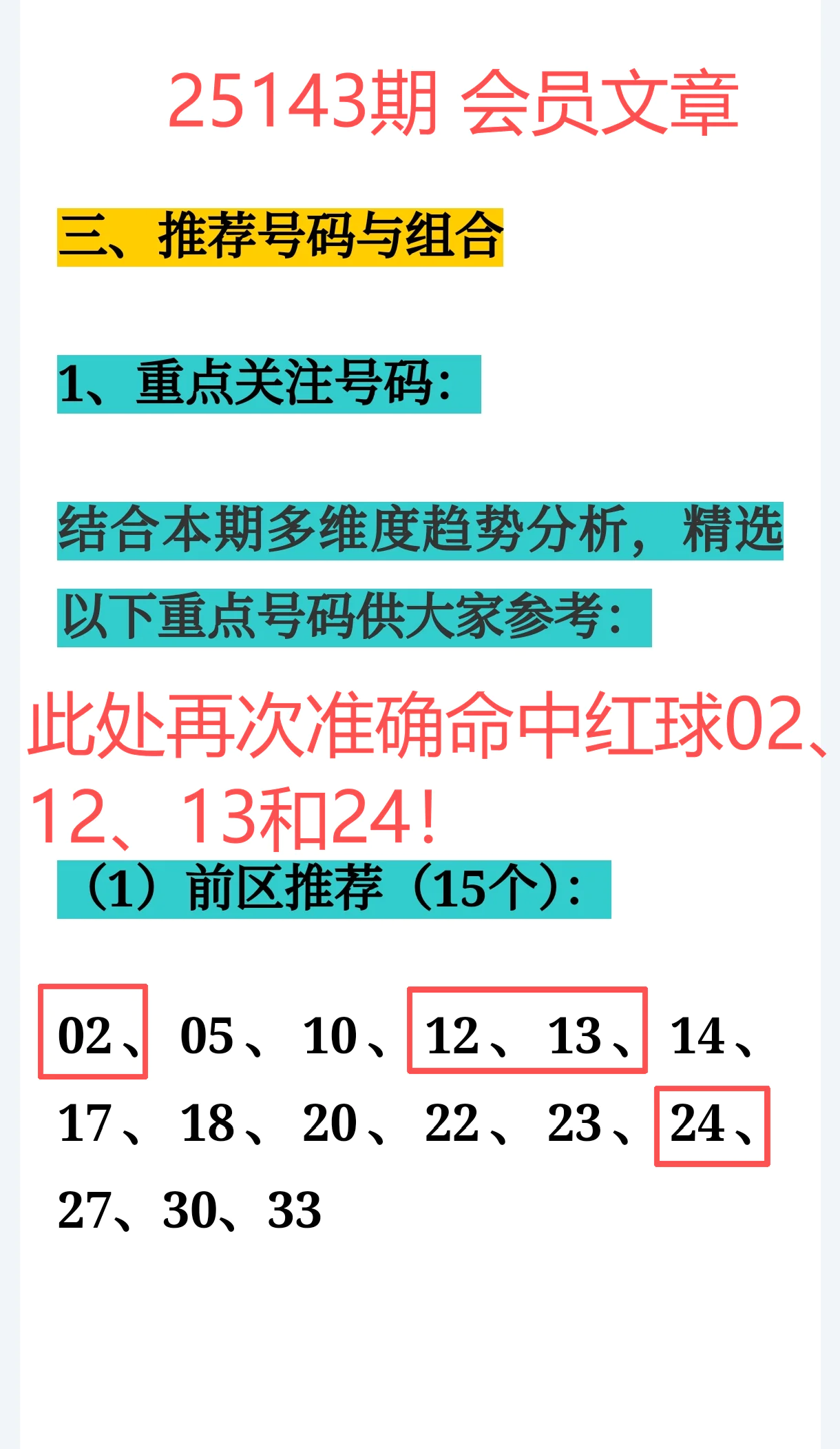 上期【免费文章+会员文章+充电体验卡】合计共命中5个红球:02、12、13、15、24,杀号再中 10个,命中效率提升近 6倍节奏把控力、过滤能力、命中稳定性再上新台阶
