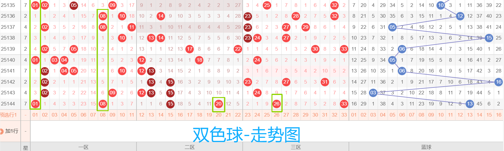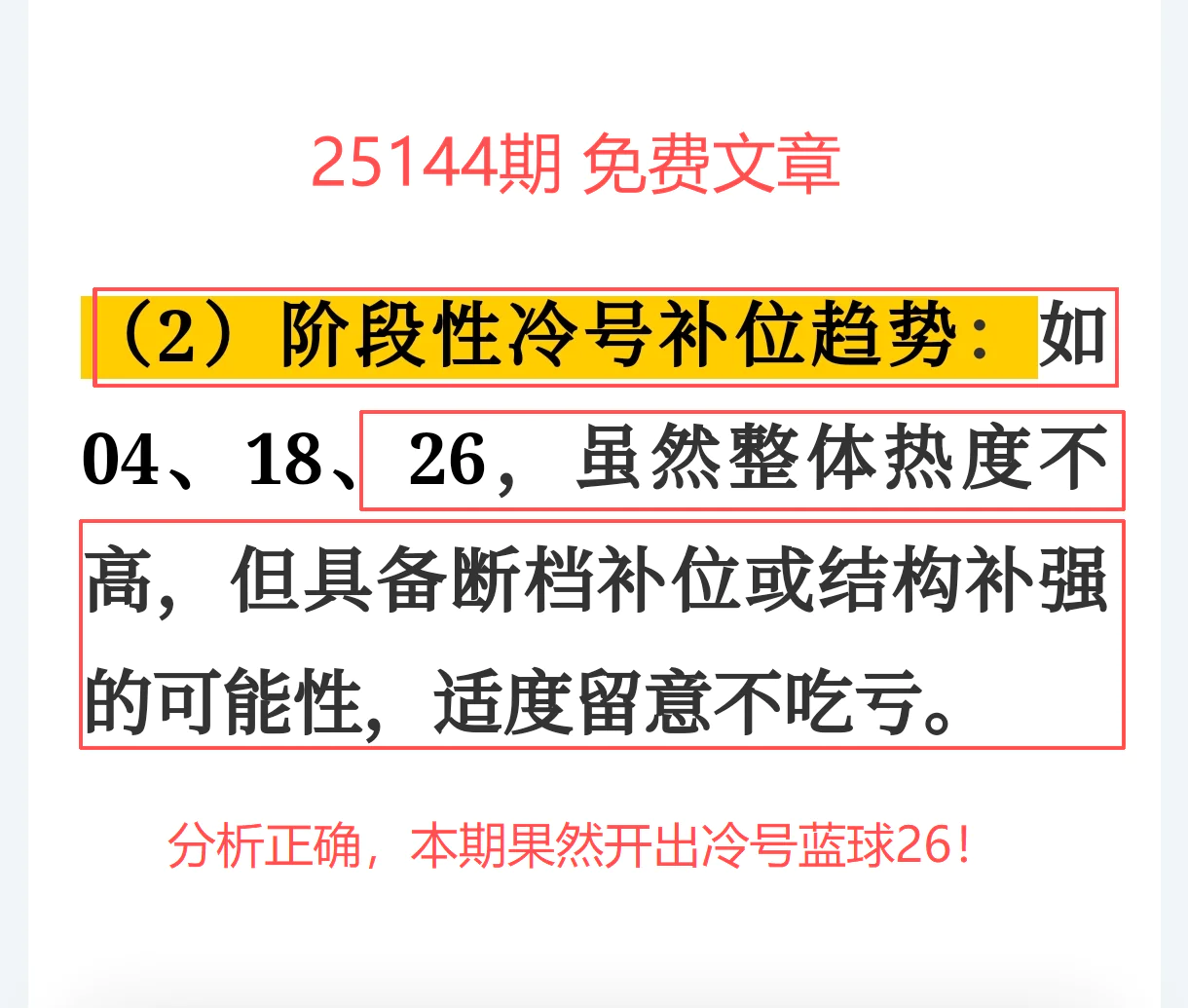 例如01在前期短暂缺席后,于25144期重新回归,释放出明显的回补信号;同时,08、20、26也属于近期出现反弹迹象的冷温号码,整体间隔不算过深,但回暖节奏较为清晰。