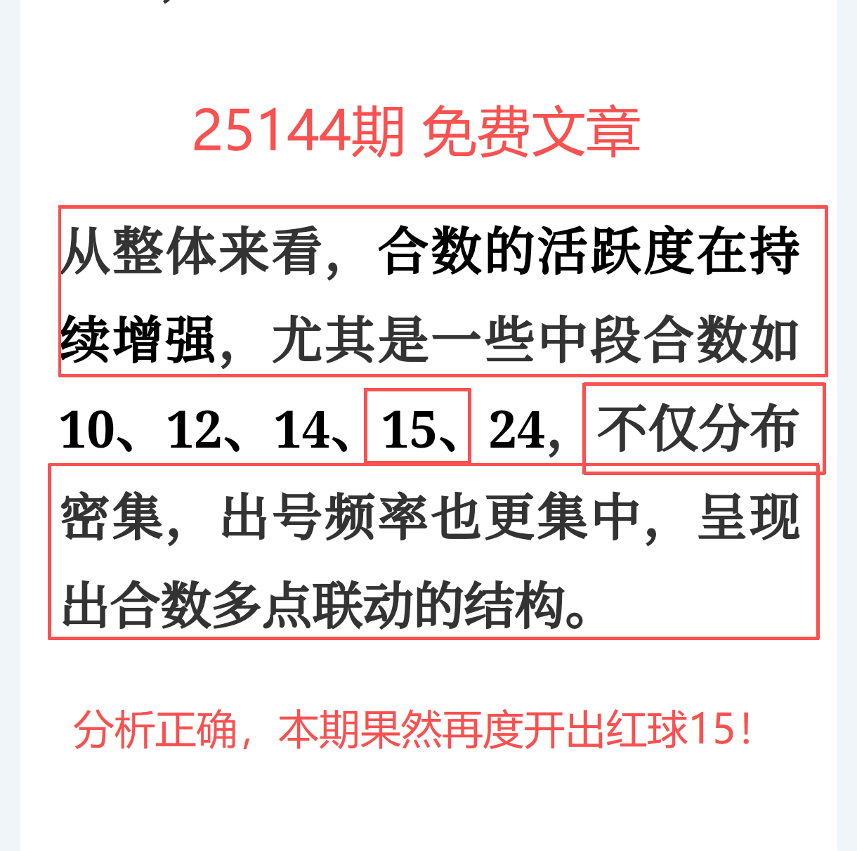 近期红球中,15连续在25144、25143、25142三期中亮相,是当前阶段最具代表性的高频活跃号码之一。