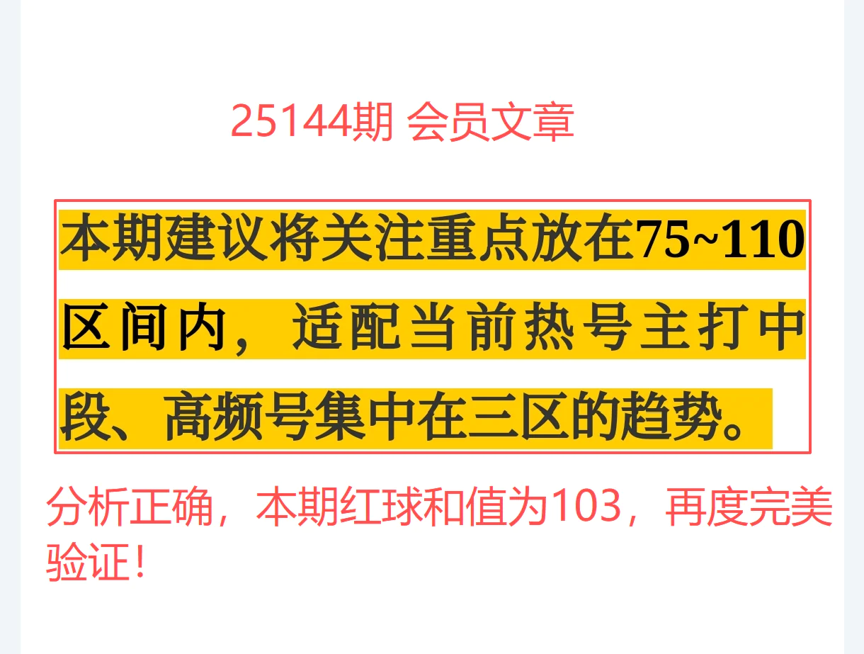 当期红球和值为 103,精确落在建议区间 75~110,区间节奏研判稳稳拿捏;